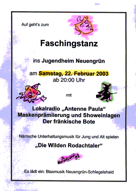 Erholen konten sich im Showteil die Bein- aber nicht die Lachmuskeln, als das Team des Lokalradiosenders "Antenne Paula" von der Gartenbank aus die großen und kleinen Dorfsensationen, Mißgeschicke und Schlitzohrigkeiten des vergangenen Jahres berichtete. Stilecht mit Arbeitskappe, -kutte und -stiefeln bekleidet lobten die Reporter Roland Schmidt, Georg Gareis, Stefan Gareis und Markus Schütz die gute Tat eines Neuengrüner Bauern, der sich nicht scheute, seinen Miststreuer drei Meter hoch aufzutürmen, um den südlichen Landkreis mit Metallwertstoffen zu versorgen. Vorbildlich war auch die Wildsau, die sich tot direkt unter einen Hochsitz legte, nicht nachahmenswert aber der junge Mann, der in seiner Liebessehnsucht übersehen hatte, daß er sein Auto in frischem Estrich abgestellt hatte und mit einem Preßlufthammer befreit werden mußte. Tontechniker Daniel Hoch lockerte die Sendung durch Werbeeinspielungen auf, in denen die Zuhörer von bisher eher als Geheimtips gehandelten