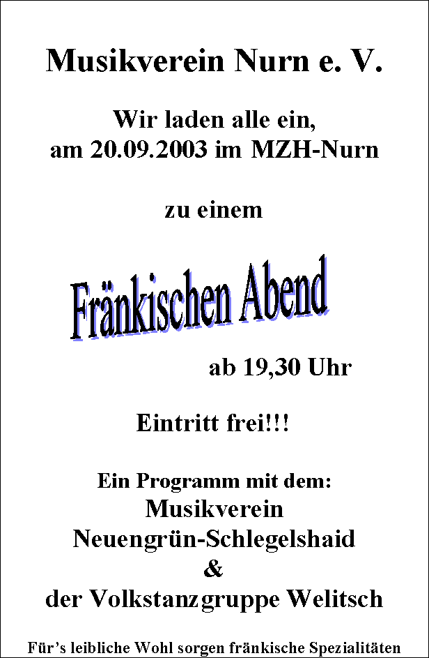 Auf Einladung des Musikvereins und gleichzeitig als Dankeschön für das Aufspielen beim Sommerfest in Neuengrün stellte die Blasmusik Neuengrün / Schlegelshaid unter Federführung von Rektor i.R. Wolfgang Eidloth einen fränkischen Abend zusammen, der im Mehrzweckhaus Nurn aufgeführt wurde. Für die Darbietung von Fränkischen Volkstänzen konnte zudem die Volkstanzgruppe Welitsch gewonnen werden, der Dirigent der Blasmusik, Adolf Klötzer, gegleitete die Gesangsstücke auf der Gitarre.