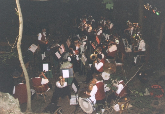 Mit Blasmusik, Gesang und Gymnastik (Ja, ja, er lebt noch ...) unterhielt der Musikverein Nurn, den unser Bild auf der Bühne, umrahmt von Felsen und Ahornbäumen zeigt.