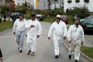 Kirchweih in Neuengrün am Sonntag, den 7. September 2001 Den weltlichen Teil des Festes hatten die Gasthäuser von Wellesberg und Neuengrün schon in der Vorwoche mit ihrem traditionellen Kirchweihspeisenangebot und ein Kerwatanz im Jugendheim eröffnet. Am Montag früh ab neun zog dann das Kirchweihkommitee mit den schwarzen Schwanzern und Zylindern begleitet von der Blasmusik durch die Ortschaften der Kirchengemeinde Neuengrün.