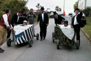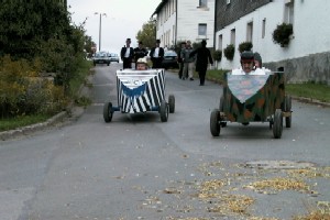 Zahlreiche Schaulustige versammelten sich auch heuer wieder am Dorfanger, um mit Spannung zu erwarten, was sich das Kirchweih-Komitee wohl diesmal für eine "Disziplin" ausgedacht hat. Als die Strecke rund um den Anger mit Strohballen von den "Drahtziehern" umrahmt wurde, ahnten viele schon, dass Geschwindigkeit im Spiel sein muss. Kurz darauf kamen die Wettstreiter aus ihren Umklejderäumen und ein erstes Lachen ging durch die Reihen. Ausgestattet mit weißen Rennanzügen und abenteuerlich ausschauenden Helmen traten die "Kampfhähne" vor das Publikum. Sie waren allerdings nicht alleine, denn beide hatten jeweils einen Mann als Verstärkung dabei. Dennoch war für alle immer noch unklar, was denn nun die Aufgabe sei. Dann endlich beendete das Kirchweih-Komitee die Neugier aller, als es zwei professionelle Seifenkisten vorfuhr, die eigens aus Neufang herbeigeschafft wurden. Sofort wurde klar, weshalb die beiden Hauptakteure einen zweiten Mann brauchten, diese dienten nämlich als Bremser. Wie sich herausstellen sollte, kamen diese erst mit dem Überfahren der Ziellinie zum Einsatz.