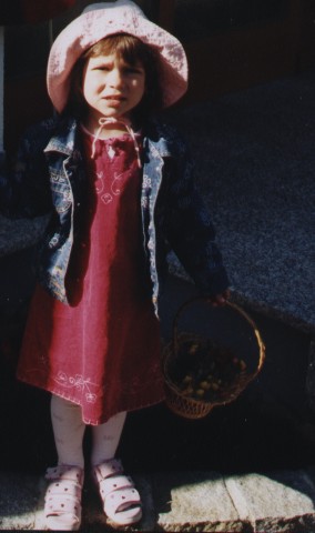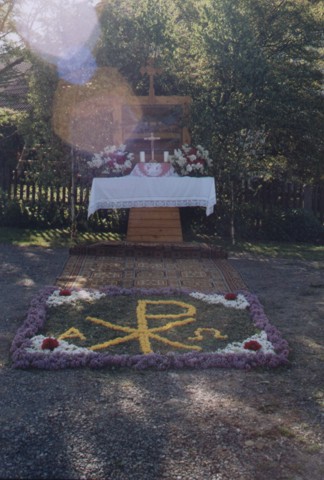 | Der vierte Altar vor dem Schrepfers-Haus mit einem Blumenteppich in der Form des Christusmonogramms geschmückt - die Morgensonne spitzt durch die Maien. (Bilder der Fronleichnamsaltäre 2004 finden sie hier.) | Eines der Blumenmädchen, die vor die Monstranz ihre Blüten ausstreuen. Erwartungsfroh! | |||