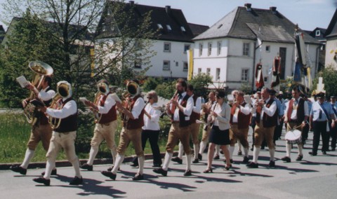 Nach der Prozession: Marsch zum Jugendheim. Vorneweg die Blasmusik mit den Soldatenkameradschaften aus Neuengrün / Schlegelshaid und Wolfersgrün ... | |||