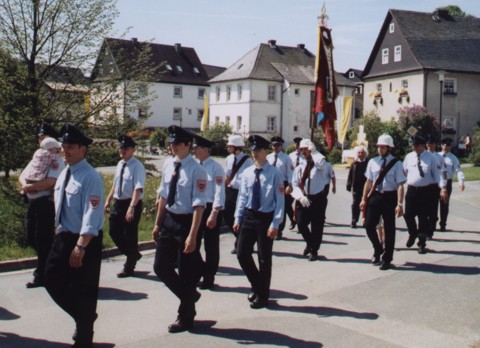 ... dann die Wolfersgrüner und die Neuengrüner Feuerwehrleute, die dem Zelebranten Pfarrer i.R. Reinhold Raffael Goldmann Geleit geben. | |||