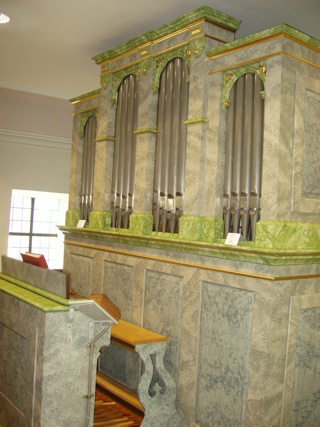Die Johann-Wolf-Orgel aus dem Jahr 1892 in wiedererstrahlter Marmorierung. Die Pfeifen konnten vollständig und die Holzmechanik fast in originaler Zusammenstellung saniert werden.