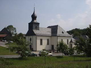 Blick auf die Kirche "Mariä Himmelfahrt" von der Dorfmitte in Richtung NO